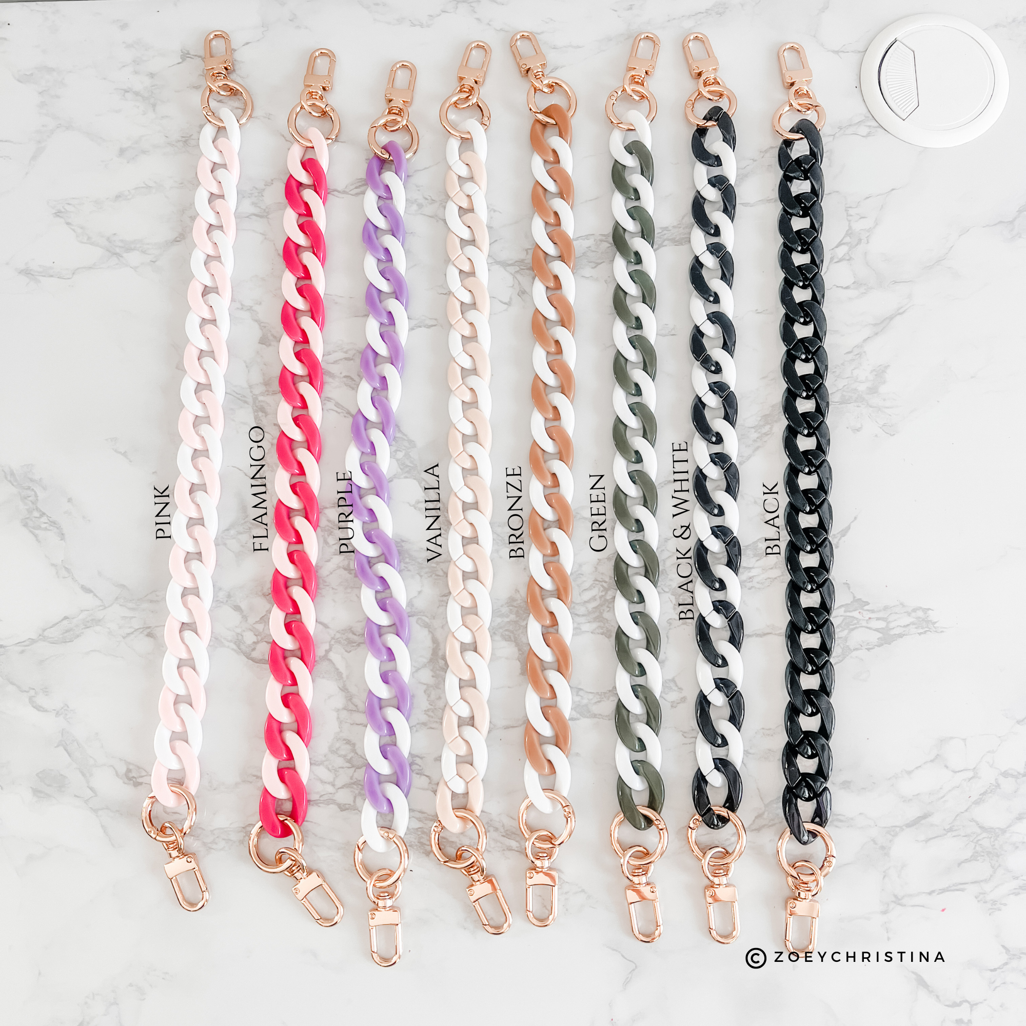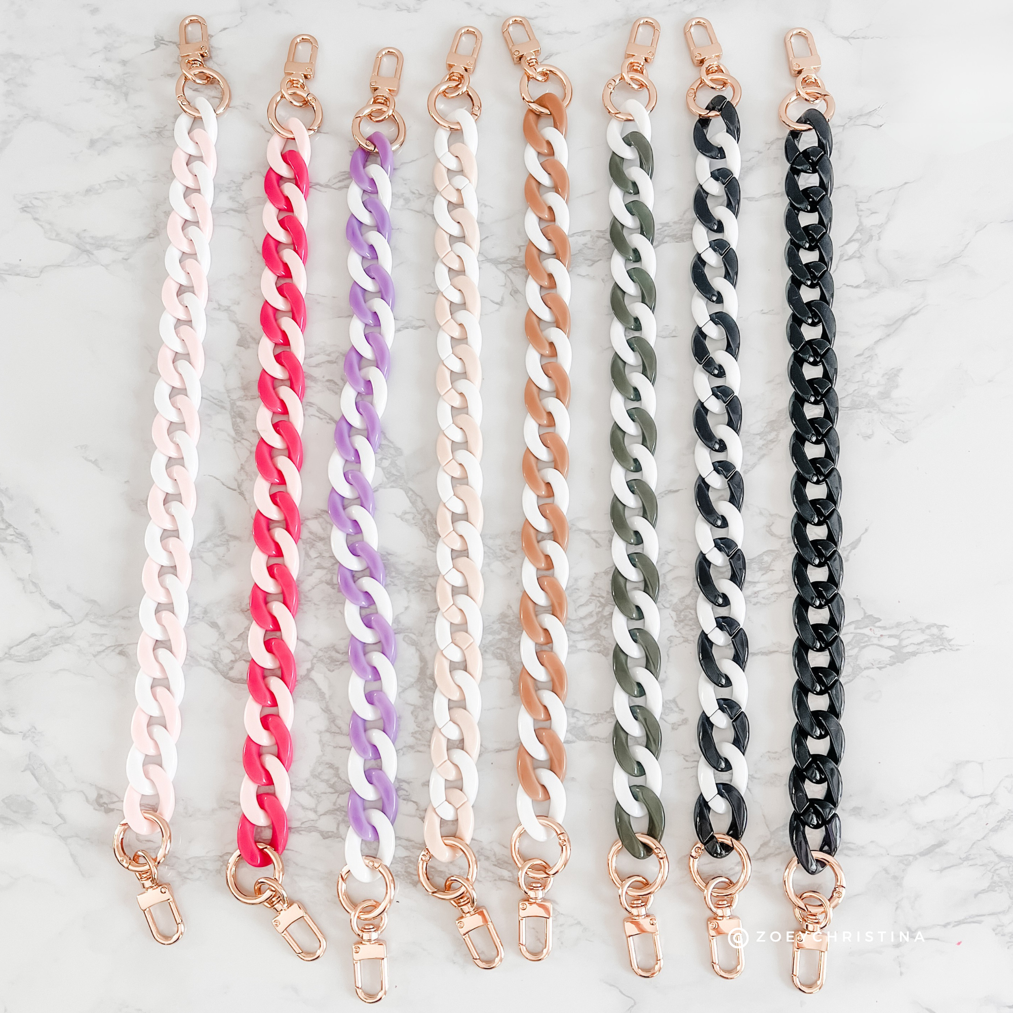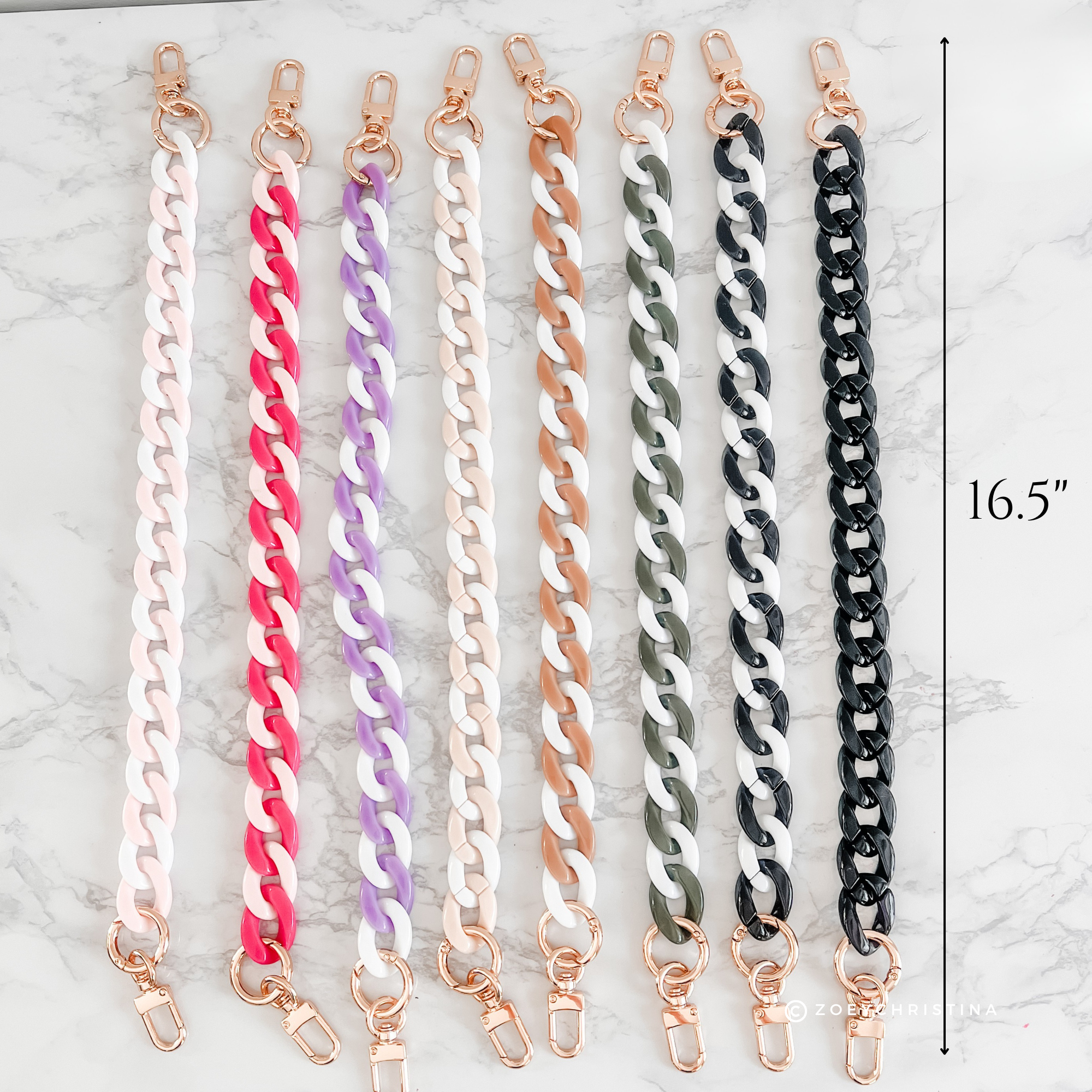 Add a bold pop of color and texture with our versatile 16.5" Chunky Acrylic Bag Chains. Perfect for shoulder or handheld bags, this decorative purse chain can also be used as a wristlet crossbody charm or stylish accessory. Make a statement in style with these functional and eye-catching bag chains!