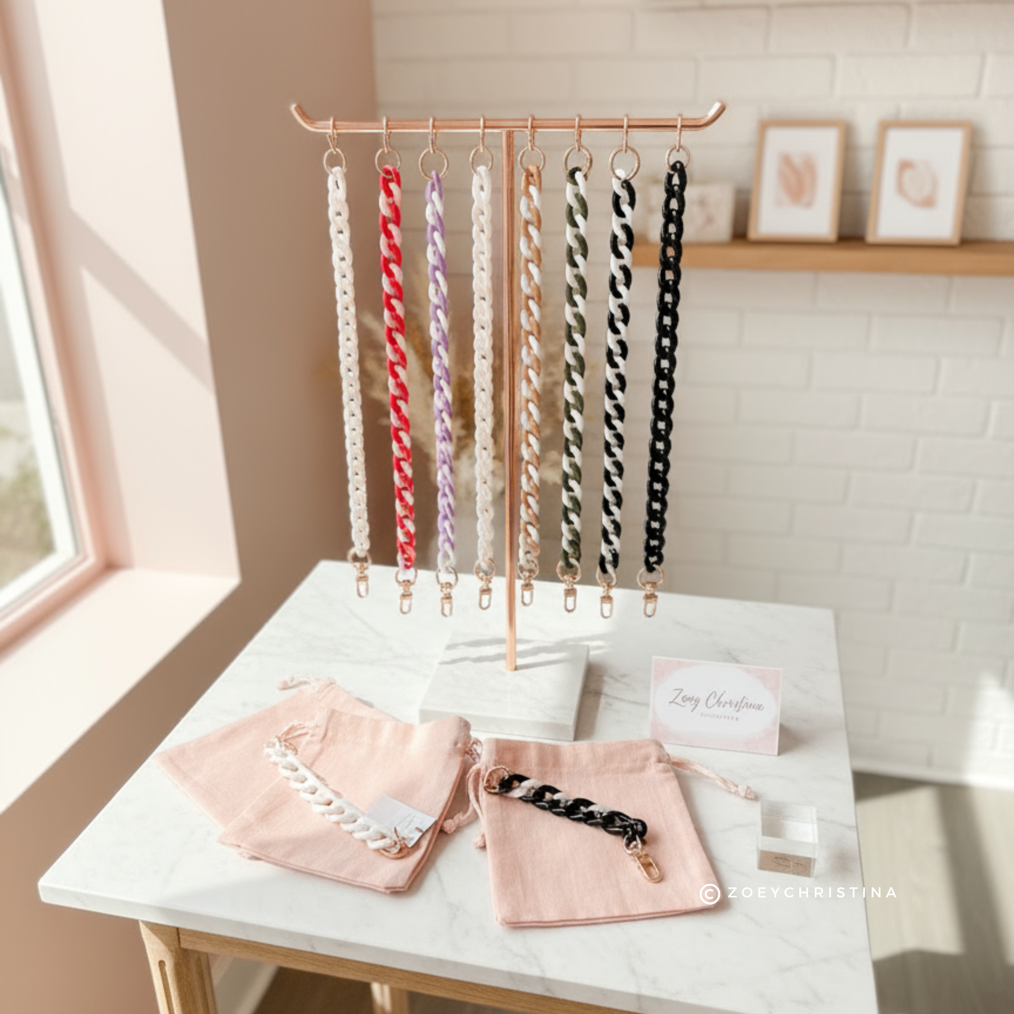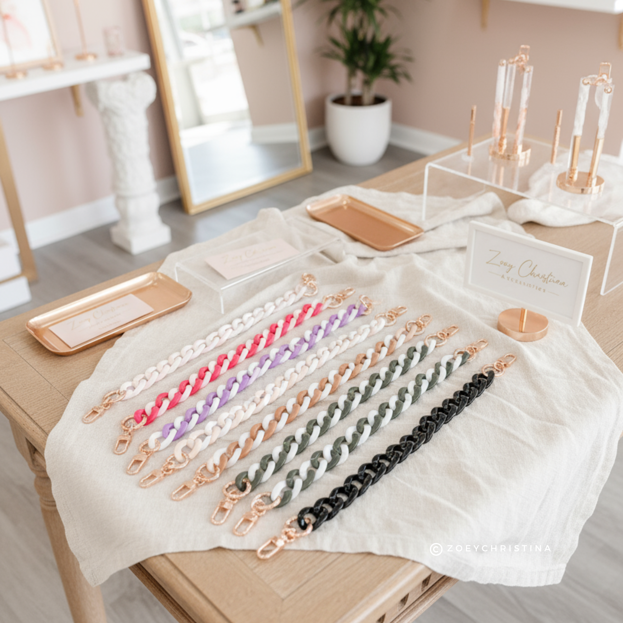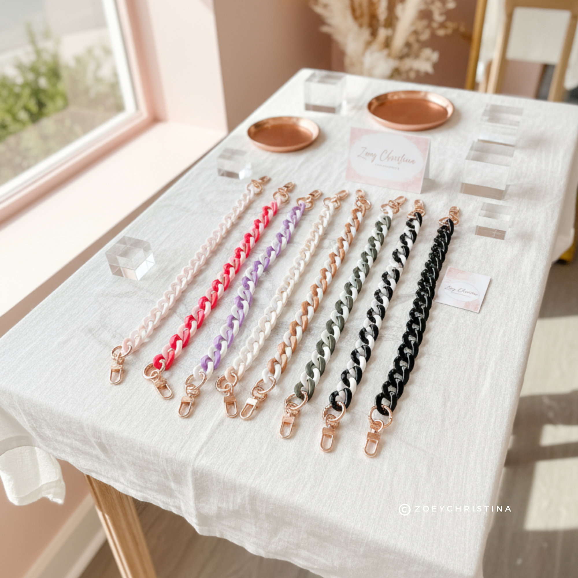 Add a bold pop of color and texture with our versatile 16.5" Chunky Acrylic Bag Chains. Perfect for shoulder or handheld bags, this decorative purse chain can also be used as a wristlet crossbody charm or stylish accessory. Make a statement in style with these functional and eye-catching bag chains!