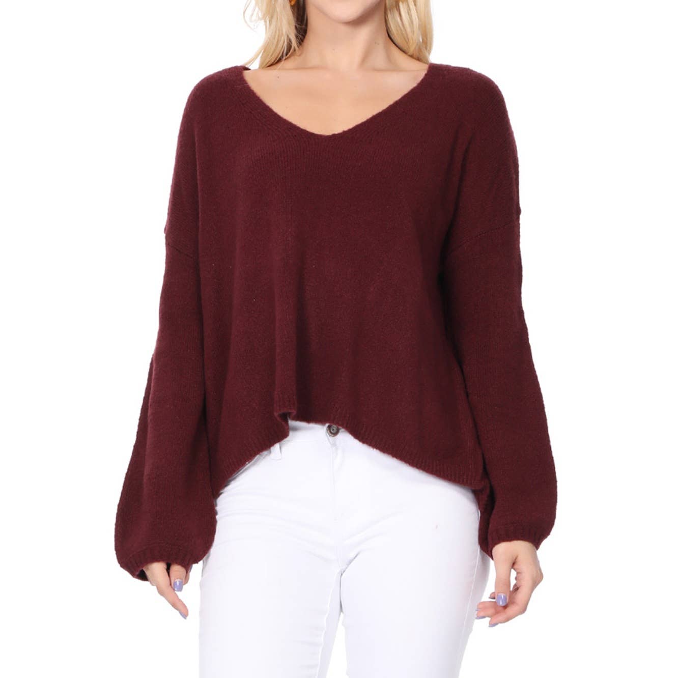 Wide V-Neck Oversized Sweater Top with Side Slit